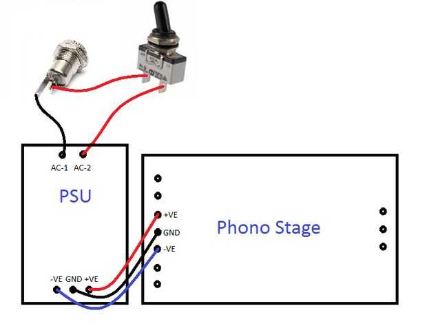 Deben torcer los dos cables desde el conector de alimentación y los tres cables entre el adaptador de red y la etapa de fono de la trenza. Esto se hace para evitar interferencias.