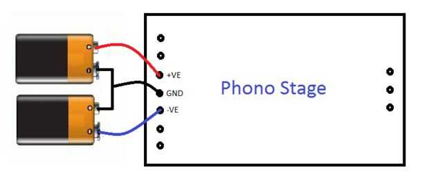 Incluso puede alimentar la etapa de fono con dos baterías de 9 voltios, y se ejecutará en ellos por semanas. Aquí es cómo, refiriéndose a la segunda y tercera foto de arriba: