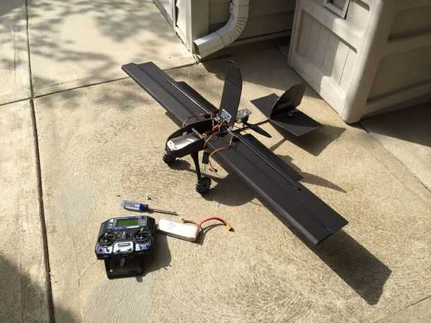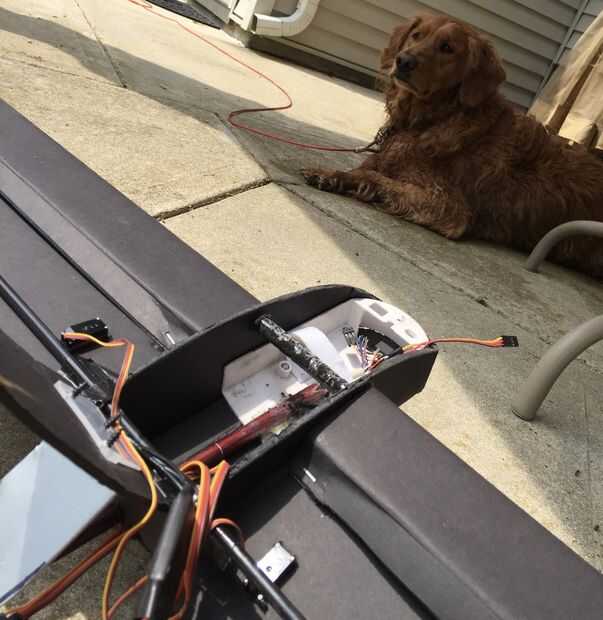No me gustó cómo los cables fueron sólo salir de la parte posterior del avión, así pescaban un cable VGA cortado a través del poste de fibra de vidrio y había cableado de las extensiones de servo a través de eso. Tardó un poco, pero hace el aspecto de avión mucho más ordenado y menos propenso a enredarse en algo con los cables colgando.