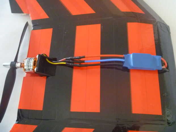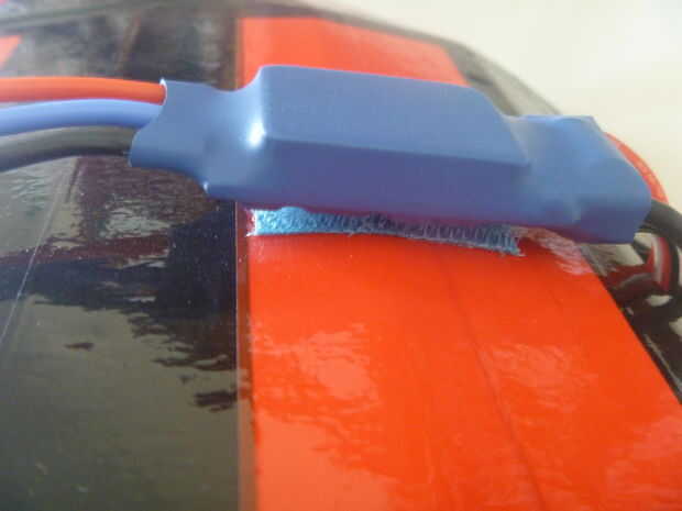 El ESC se monta tan adelante como es permitido por la longitud de los cables. Velcro se utiliza para esto - pegarlo justo en la parte superior de la cinta. Está bien si el velcro no está montado sobre una superficie plana. El mío es justo en medio de una curva de la superficie de sustentación, y el Velcro se ajusta a él muy bien.