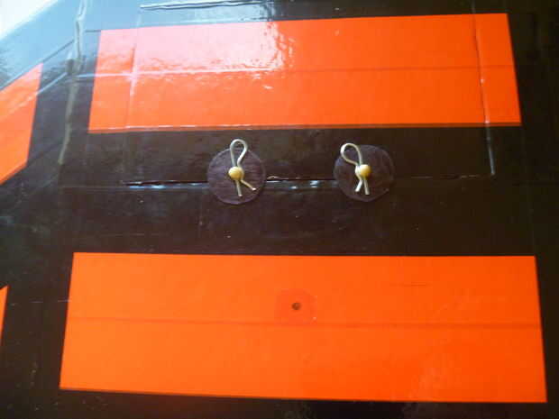 -Hice un par de arandelas de la tapa de un envase de alimento plástico, pero esto no es necesario - sólo evita que la espuma abolla tan malas cuando las clavijas se ponen en práctica. Los colores negro con rotulador.