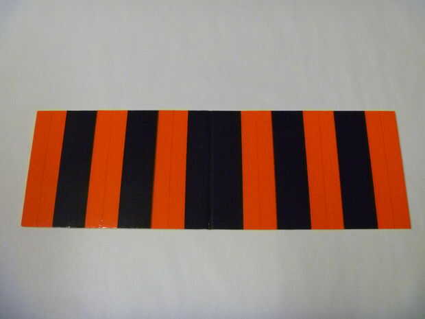 -Al grabar esta parte y las mitades del ala, comience con la espuma cortado pero no montado todavía. Empezar a grabar en cualquiera de los extremos y su forma de trabajo hacia el centro - esto significa que el aire a fluir con la cinta y tire contra él. Cada raya es espesores de cinta 2. La última pieza de la cinta en que pones debe ser sobre la línea de doble bisel, que es el borde de ataque. Si nos fijamos en la imagen, verás que tengo 5 rayas a cada lado de un negro espeso. Antes de poner en la última pieza de la cinta, tenía 6 rayas a ambos lados de una tira no con cinta blanca. La última pieza de cinta completa el trabajo.