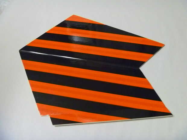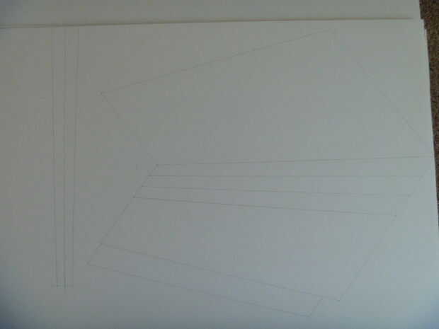 -Las mitades del ala como la sección central de la cinta: de afuera hacia adentro. Superpuesto la cinta mucho en las mitades del ala porque hice las rayas coinciden con los de la sección central. Porque las alas son arrastradas hacia atrás, las bandas son más estrechas. A lo largo del borde que se reúne con la sección de centro es donde mides de, pero porque esa línea está en ángulo a la línea de las rayas del recorrido, hace que las rayas se estrecha (siento tienes que pasar por esa explicación). Utilicé un cuadrado de ángulo recto para encontrar líneas paralelas a la vanguardia (marca 2 puntos perpendiculares a la dirección del borde y conectarlos) - las líneas son lo que la cinta sigue.