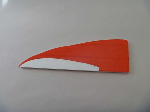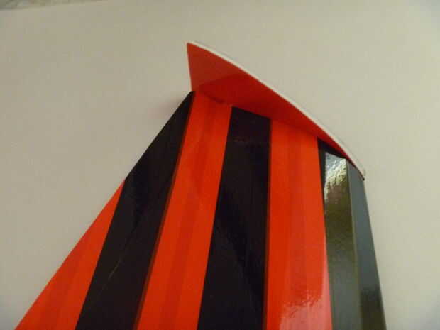 Mantenga la parte no grabada de la aletilla contra la punta del ala en la posición deseada. trazar la curva de la superficie de sustentación sobre la superficie blanca con un lápiz y oscurecer la línea ligeramente si es necesario. Entonces, ligeramente Coloque la cinta sobre la superficie - la marca del lápiz debe mostrar a través de la cinta semitransparente. Corte la cinta a lo largo de eso línea muy ligeramente y retire solamente la parte que cubre la punta del ala. Entonces pulse la cinta firmemente.