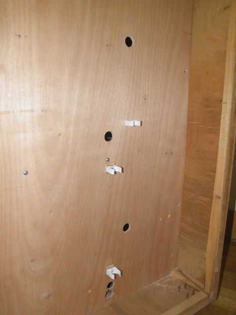En este punto es tiempo de hacer cuatro agujeros en el separador entre la sección principal y la sección lateral del lavavajillas. Dos tubos llevará agua a las tinas, y dos a drenar agua. Mida la distancia desde la parte delantera del bastidor en la parte posterior de las tinas. Desea el agua de detrás de cada tina y preferentemente sólo un poco más alto que el fondo de cada uno (por lo que el agua tenderá a fluir fuera de la máquina en lugar de sentarse en el sistema. No gran cosa, realmente).