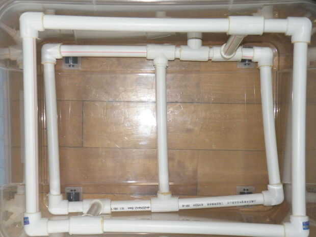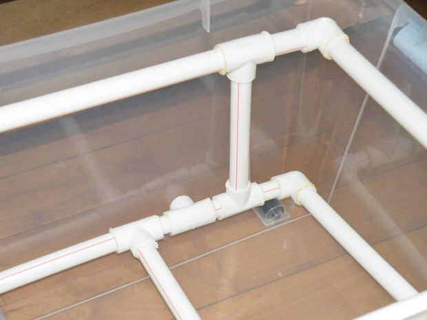 Cada tina tendrá un pulverizador para rociar el agua sobre los platos. La mejor solución que podría venir para arriba con (después de fallar con varias otras ideas) era tienen un marco de tubos alrededor de los bordes, y perforar pequeños agujeros para que el agua rociar. La desventaja con este diseño es que el rociador estacionario, así que puede ser difícil conseguir que el agua rociado por todas partes en todos los platos. Traté de compensar esto haciendo los orificios pequeños y muchos de ellos, pero está todavía lejos de ser óptima.