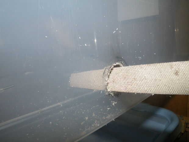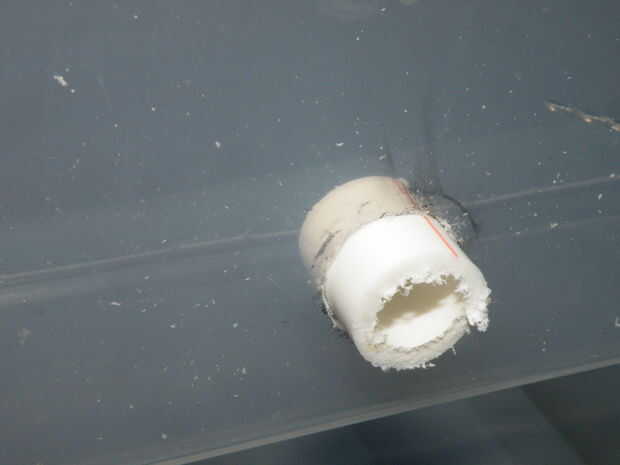 Una vez que el marco de la tubería en su lugar en cada tina, es hora de hacer un lugar para el agua de entrada. Para ello tienes que cortar un agujero en el lado de la bañera. Adviértase que algunos plástico es propensa a agrietarse, por lo que necesitará tener mucho cuidado. Hay varias maneras que usted puede hacer esto (por ejemplo, este cabezal puede hacer el truco), pero va a utilizar un taladro eléctrico y un archivo.