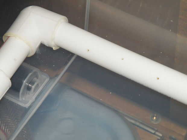 Perfore un montón de pequeños agujeros en la tubería en las tinas de agua para rociar. Inicio el más pequeño tamaño del taladro y ángulo de todas manera que apunten hacia donde estarán los platos. Siempre puede agregar más adelante, para no dejarse demasiado lejos. Desea que la presión del agua a ser muy fuerte; también muchos agujeros lo debilitará.
