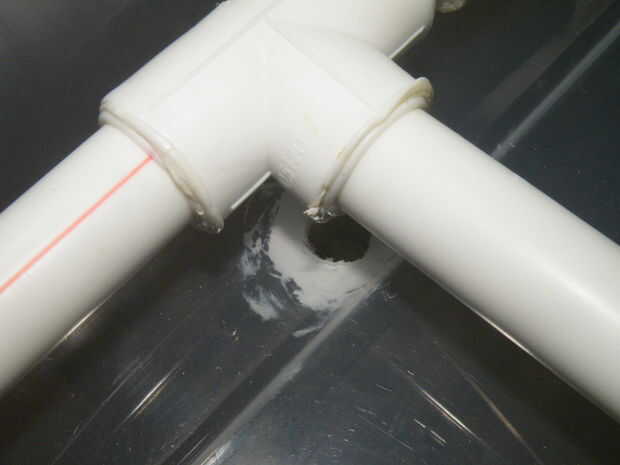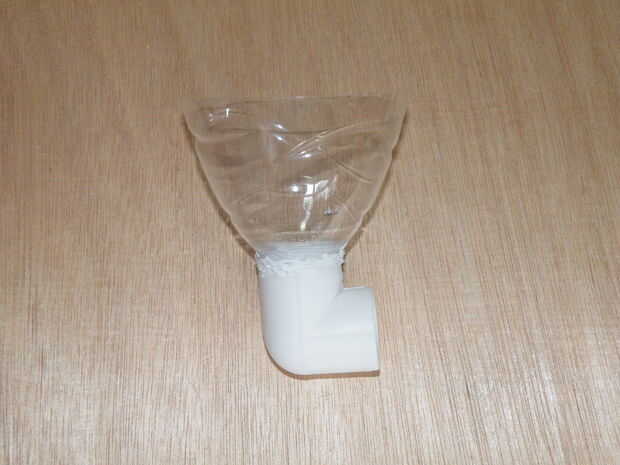 Cortar la parte superior de cada botella de agua, tratando de dejar el tamaño de embudo tan grande como sea posible, pero la altura del embudo tan corto como sea posible. Corte los hilos de rosca (donde la tapa de la botella de agua tornillos) para hacerlas más cortas. Usar sellador para el embudo a un codo de la pipa del "pegamento". Esta pieza se sientan justo debajo del desagüe y recoger el agua.