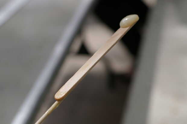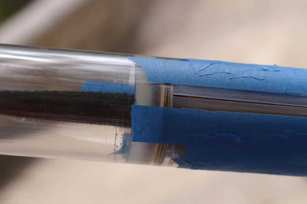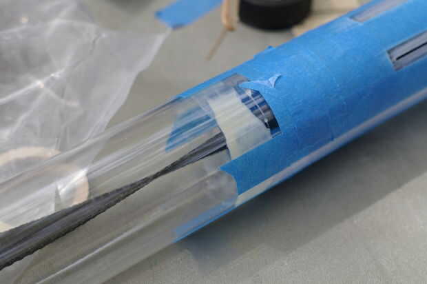Inserte el MMT con alagodón cable de choque en el fuselaje, con un movimiento giratorio a difundir alrededor de epoxy. Alinee el anillo con la ranura de la aleta de centrado como se muestra, como lo cuando nos pega el anillo de centrado en primer lugar.
