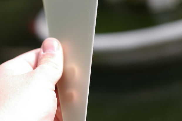Usted quiere usar algo un poco más fino en G10, probablemente como un grano de 150, o incluso una lija de grano 220. En primer lugar, por su propia seguridad, desea redondear los bordes de las aletas. Esto es sólo una medida de prevención de astilla, aunque los bordes lisos redondeados de las aletas toque un buen profesional. No trate de afilar las aletas; sólo te degradan como tierras repetidamente en el duro suelo del desierto. He intentado este proceso en las dos primeras imágenes.