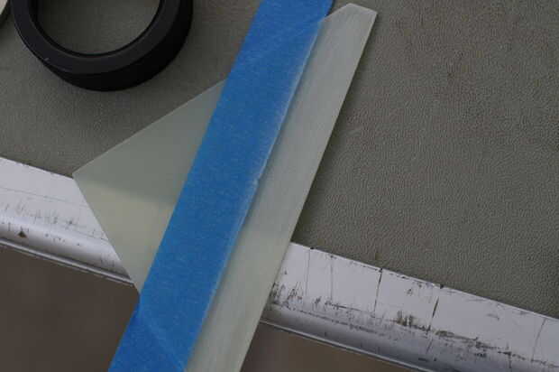 Entonces, queremos a la arena para adhesivo epoxi. Enmascaramiento no es necesario pero me gusta, parece bueno. La cinta se coloca 1/4" de donde la armadura de avión reunirá la aleta, que es identificada por los rincones donde el grifo de la aleta rectangular se une a las aletas del triángulo. En la fibra de vidrio de la arena hasta que pueda ver este patrón cuando se seque la aleta; no ayuda a ir más allá.