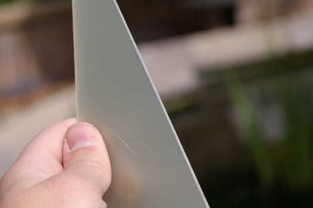 Las aletas están hechas de un material llamado Garolite G10/FR4. Es una resina fenólica de fibra de vidrio. Lijado de fibra de vidrio produce partículas que, dependiendo de su tamaño, pueden causar cáncer o simplemente la suciedad hasta su sistema respiratorio. Por eso es importante que cuando usted arena fibra de vidrio, arena se bajo corriendo el agua. Esto se llama lija en húmedo, y es una práctica de seguridad estándar.