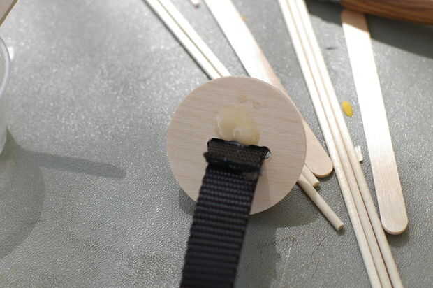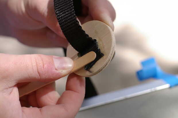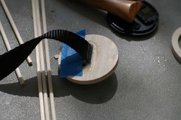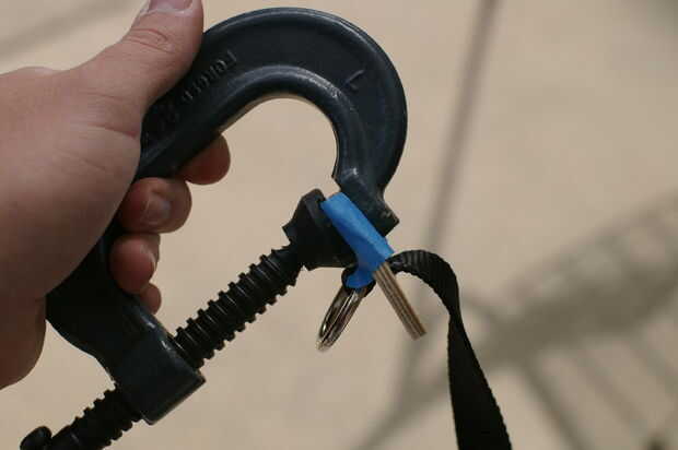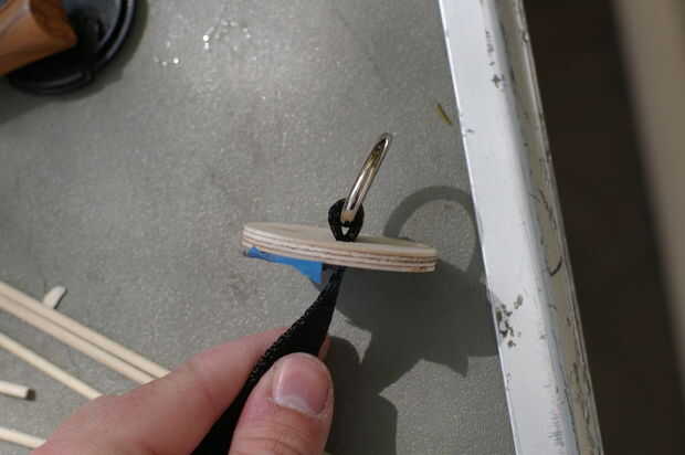 Tomar el cable y pasarlo a través de lo bulkplate-como con la ranura y el anillo en D como se muestra, de epoxy y la abrazadera como se muestra. Espere a que el epoxy se seque.