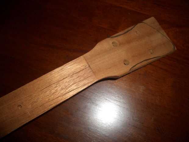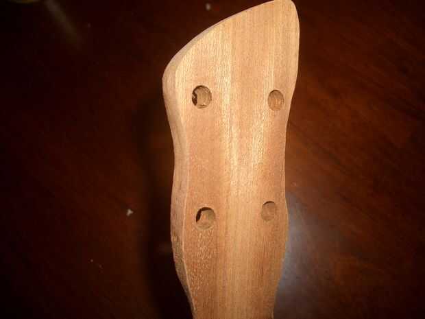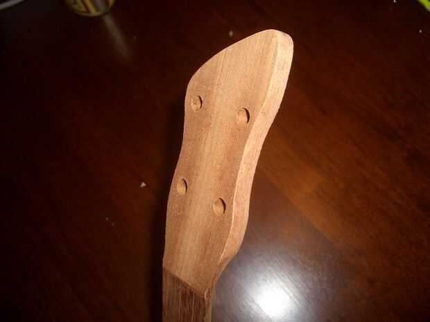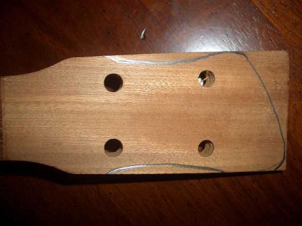 En primer lugar, que libre a lápiz un diseño en el cabezal que me ha gustado, teniendo cuidado de dejar suficiente espacio alrededor de los orificios de la peg para fuerza y para los bujes de peg se superponen. Después de dibujar el diseño, usé una sierra de marquetería con una hoja delgada para cortar la parte sobrante. Una sierra de contornear probablemente habría sido la herramienta ideal para este corte, pero no tiene uno, así que utilicé una sierra de marquetería. Aquí es una sugerencia. Al cortar, cortar fuera de la línea, para que el lijado de acabado final coloca en la línea. Como puede ver en las fotos, mientras que tenía un montón de madera a la izquierda, el cabezal resultó un poco más estrecho que estaba inicialmente previsto.