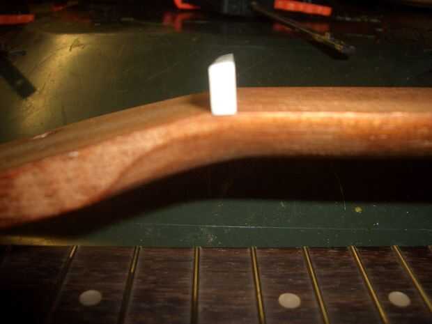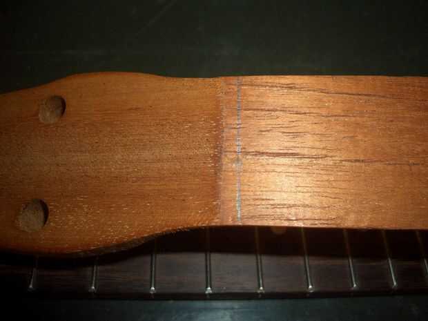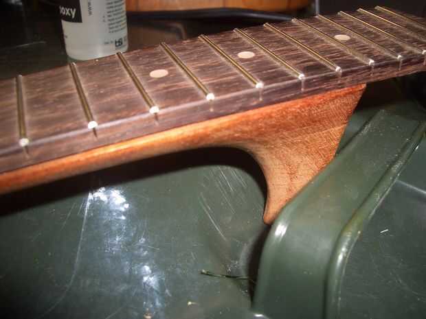 Después de cubrir la parte inferior del diapasón con una fina capa de epoxi, cuidadosamente Alinee cada borde, alinee el borde superior del diapasón con la línea de lápiz que marca la parte inferior de la tuerca y alinee la línea central marcada en la parte inferior del diapasón con la línea central en el extremo inferior del cuello. Cuando appliing el epoxi, recuerde que usted tendrá algún apretón hacia fuera los lados. Para reducir este tanto como sea posible, asegúrese de dejar por lo menos 1/4" entre el epoxy y el borde de la madera que se aplica a. Mucho espacio y terminarás con un hueco en el cuello terminado entre el diapasón y el cuello, no hay suficiente espacio y usted terminará haciendo mucho más acabado lijado para eliminar todo el exceso, secado de epoxy que exprimido hacia fuera. Utilice abrazaderas suficientes a lo largo de la longitud del cuello para fijar todo en su lugar mientras las curas de epoxy. Este epoxi dice seca en 10 minutos y es manejable en 1 hora, pero ya que será lijado de algún exceso epoxy que exprimido hacia fuera, planeo en espera hasta el día siguiente para comenzar ese proceso.