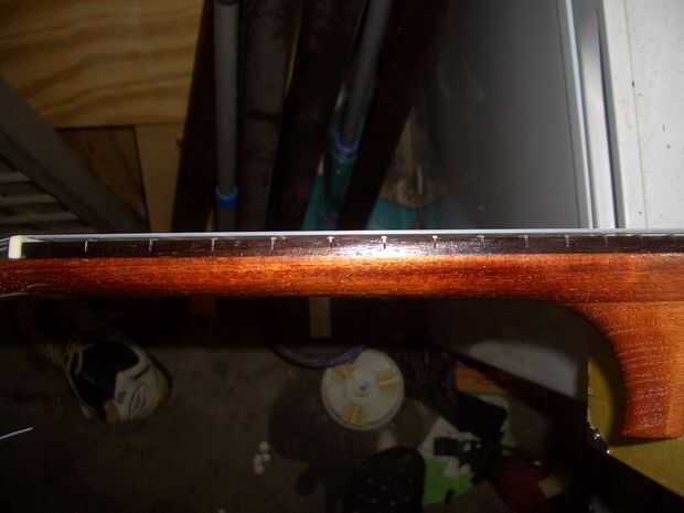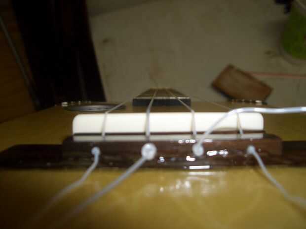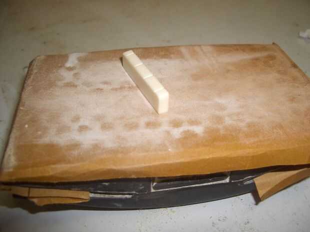 Antes de ajuste final, debe ajustarse la altura de cadena para que la acción a ser jugables a lo largo de los trastes. Una vez que las cuerdas están en su lugar, mira desde el lado para ver cuánto necesitan bajar las cuerdas. Empezar a configurar la acción con la tuerca, luego hacer ajuste final a la silla de montar si es necesario. Para hacer ajustes, lije la tuerca del hueso o silla de montar sobre una superficie plana hasta conseguir una altura uniforme en todas las cadenas. Tenga cuidado de no hacer demasiado. Arena, introducirlo, mirarlo y vuelva a intentarlo. Una vez la tuerca, ver si necesita ajustar la silla de montar. En mi generación, la acción fue buena después de lijar solo la tuerca. Una vez que la acción está definida, usted puede pegar la tuerca en su lugar, pero en mi generación que voy a dejar sólo llevó a cabo en lugar por la tensión de la cuerda.