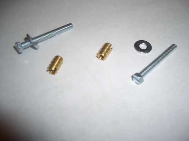 Para instalar el cuello a la caja, tengo pensado en intentar algo que yo visto antes. Mientras que en la ferretería, encontré estas inserciones roscadas de madera que planeo sobre la instalación en la base del cuello, perforar la caja y luego montar los tornillos a través del interior de la caja en el cuello. Éstos vienen en varios tamaños, estos son tornillos de máquina de tamaño 10-24 y creo que los insertos de 1/4" OD y emparejar 10-24 hilos en el interior.