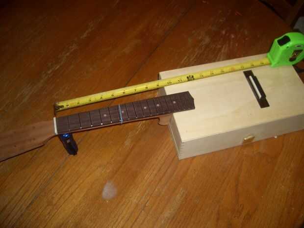 Puesto que el cuadro fue apoyado muy fuertemente en este punto, considera no apoya la tapa armónica en todo y probablemente podría haber conseguido lejos con él. Sin embargo, puesto que había decidido utilizar un puente fijo, una de las llaves 3/8" desecho había rasgado por la mitad y había pegado en su lugar un poco más arriba de donde se colocaba el puente en el uke terminado. Para encontrar este lugar, sostenía el cuello, el diapasón y la tuerca en lugar y miden 17" baja por el cuello a la caja de la tuerca. 17" es un largo de escala típica para un uke de tenor. Luego coloca la silla de montar en el puente y alineado el sillín con la 17" marca de la tuerca. Hice entonces garantizar que el soporte de caja de resonancia no era directamente debajo de donde el puente tendría que ser (para que las vibraciones no ser saturadas demasiado.) Pegué la rodillera de 1" por encima de donde se colocaba la tapa armónica.