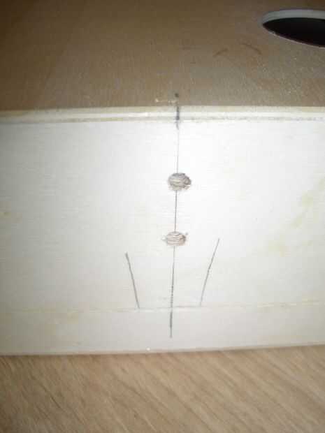 Empezando por el cuello encuentra la mejor posición para colocar los insertos roscados, que en mi cuello era 3/4" y 1 1/2" de la parte superior y los orificios en el cuello un poco más profundo que los insertos perforados. Tenga en cuenta que mi objetivo en los orificios del cuello no estaba exactamente perfecto con un taladro de mano y bajé ligeramente centro. Entonces tuve que compensar por perforar la caja ligeramente fuera de centro también. No es gran cosa, siempre y cuando empareja para arriba.