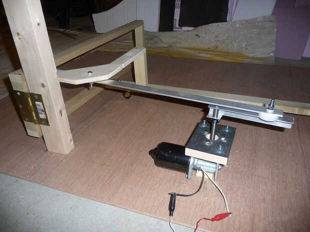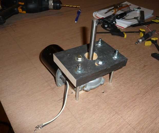 A partir de un cuadrado de madera contrachapada para actuar como una base sólida y lisa, dosificado los dos lugares claves: el centro de la bisagra de la escalera y el centro del eje del motor. Entonces firmemente montado el motor a la base por lo que su salida eje fue justo en la posición.