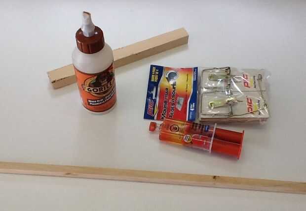 Algunas madera prensada o madera contrachapada de 1/4"(6mm) espesor de las paredes, algunas finas tiras de madera, como el pasador cuadrado 3/8"(10mm) de frontera borde, pegamento para madera, pegamento epoxi, trampas para ratones-tengo 4 por un dólar, y algunos desechos pino.