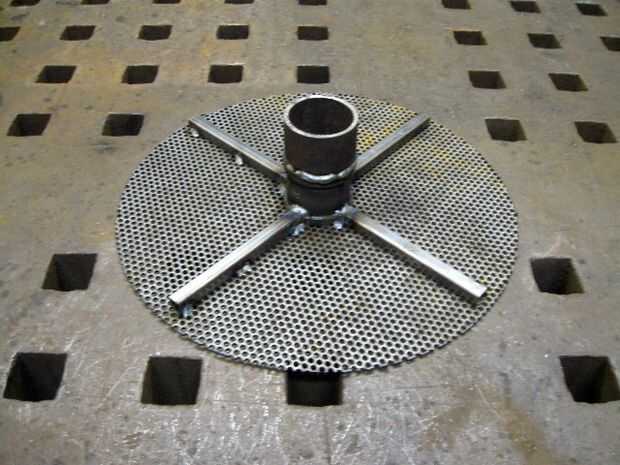 • Soldar tubos de acoplador del centro hacia fuera axialmente a lo largo de la parte inferior de la rejilla. Asegúrese de ajustar la rejilla mientras se suelda para evitar deformaciones. Algunas soldaduras de punto están bien. No es necesario para una soldadura de longitud completa.