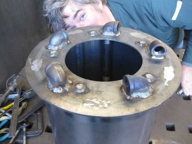 o interior de Reactor. Los codos deben estar alineados para que la entrada de aire pezones se levantan hacia arriba y paralelo a la nave de aislamiento tubo pared. Puede utilizar un ángulo recto para dibujar líneas rectas verticales hasta el interior para la alineación. Luego use un 12", más o menos 1/2" niple con un acoplador en el extremo para firmar a esta línea. Empuje el codo y el acoplador de contra la pared para asegurar la orientación paralela a la pared. Alineación vertical ayuda una escuadra de combinación. La línea y los collares de acoplador, codo son tus herramientas de alineación de plantilla. Utilizar una pinza para sujetar la plantilla en su lugar.