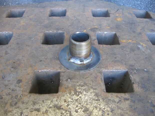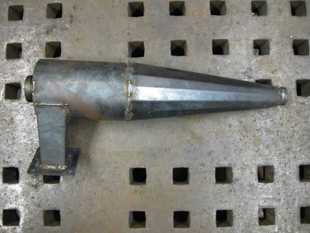 • La mitad de un acoplador de 1" de soldadura en la parte inferior de la forma cónica del ciclón. Utilice una boquilla de 1" atornillada en el acoplador y soldadura para asegurarse de que el acoplador esté alineado en la parte inferior de la forma cónica. Es visible en la punta del cono del ciclón en la foto de la izquierda abajo.
