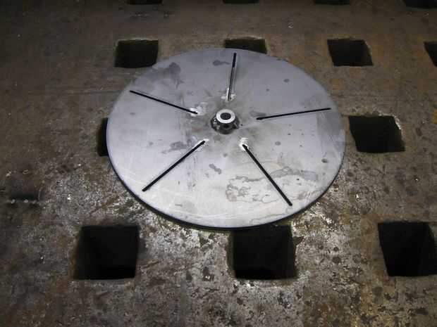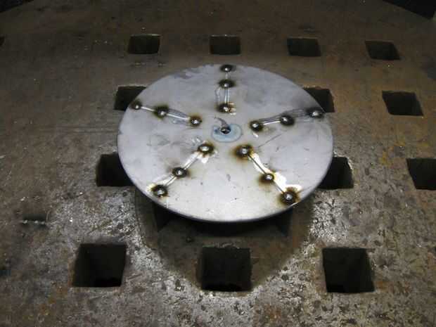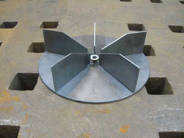 • Coloque una hoja en la ranura, utilizando la pestaña de la hoja. Ajuste la hoja de tal manera que el borde exterior esté al ras con el borde de la placa. Hacer 3 soldaduras pequeñas a lo largo de la pestaña de la hoja en la parte inferior de la placa para asegurarla. Asegúrese de que las hojas tienen exactamente 90 grados a la placa. Repita hasta que esté listo. 3 pequeñas soldaduras para cada hoja en la parte inferior de la placa es suficiente. Asegúrese de que sus soldaduras están espaciadas uniformemente, esto hará que el ventilador se mantiene equilibrado en funcionamiento. Moler las protuberancias de soldadura hacia abajo uniformemente.