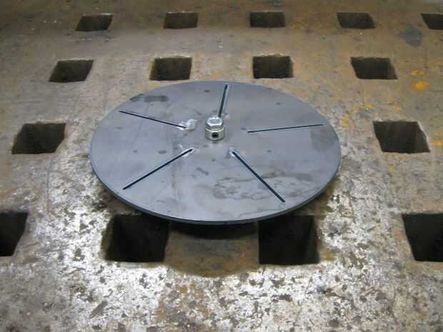 • Perfore el agujero del eje en el centro de la placa con un 5/16" bits. Inserte un perno de 5/16" a través del collar del eje y luego a través de la placa, agregando una tuerca de apriete en el otro lado de la placa. Asegúrese de colocar el collar que la cabeza del tornillo de ajuste está orientada a mitad de camino entre las ranuras de la lámina. Una vez que las láminas están soldadas en garantizar acceso al tornillo. Soldar con autógena el collar del eje a la placa, todo excepto que interfiera con el tornillo de ajuste. Quite el perno y la tuerca.