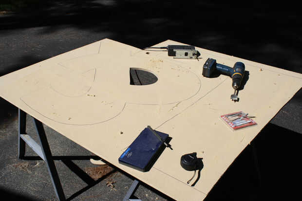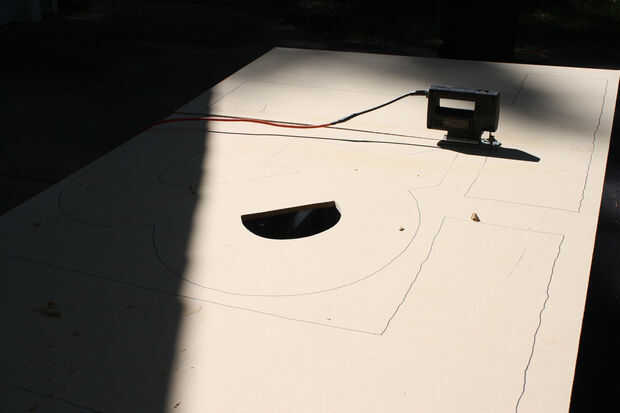 Una vez has transferido los impresos a la acción de la hoja, transferir la hoja a un conjunto robusto de caballetes o una mesa de trabajo. Después te pones las gafas de seguridad, corte los orificios de alivio para darle acceso a cortes de interior (en el caso de mis cartas, el interior de la y comercial) con una pala poco o agujero Sierra.