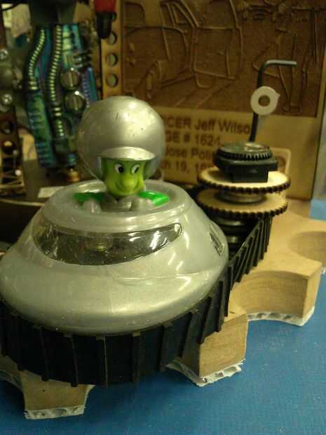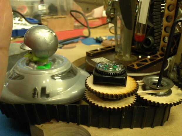 5). pasar al conjunto de engranajes es ejes de engranaje para la parte trasera de la nave espacial alienígena. El objeto es una brújula en el conjunto de engranajes del pegamento y tiene la opción de dos imanes pasando engranajes y que influyen en el campo magnético de la brújula.