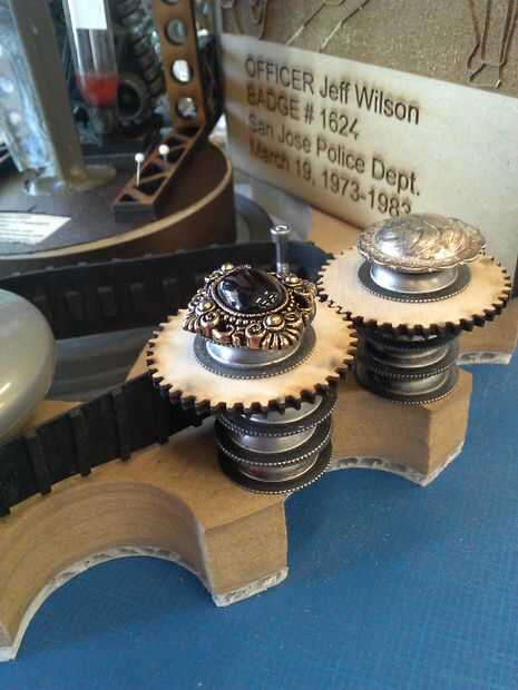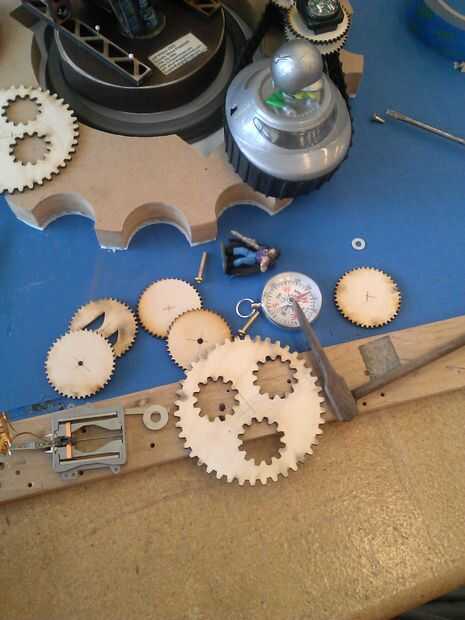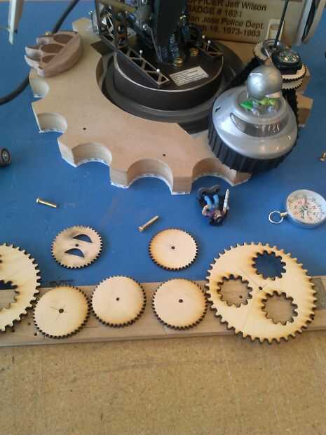 3). engranajes madera emparejadas y uso orificio central herramienta finder para buscar centros y perforar.