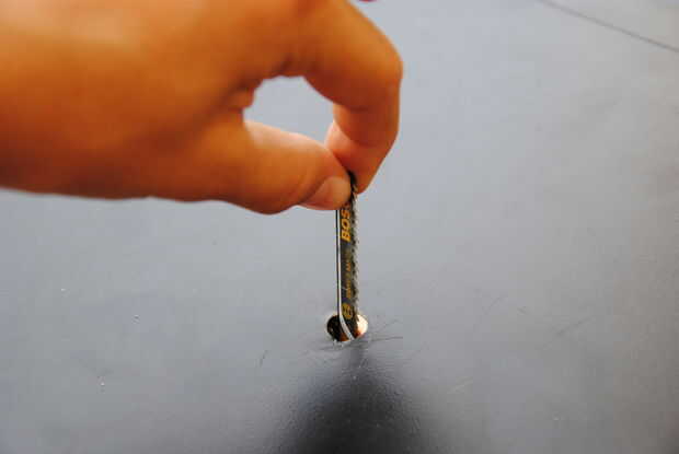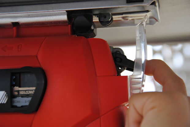 2. Inserte el una hoja en la Sierra de vaivén: tire abajo la abrazadera e inserte la hoja desde arriba.