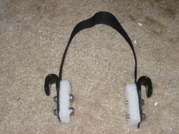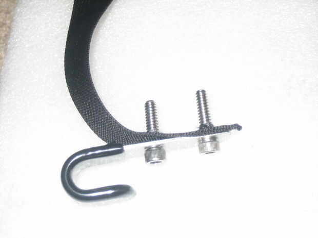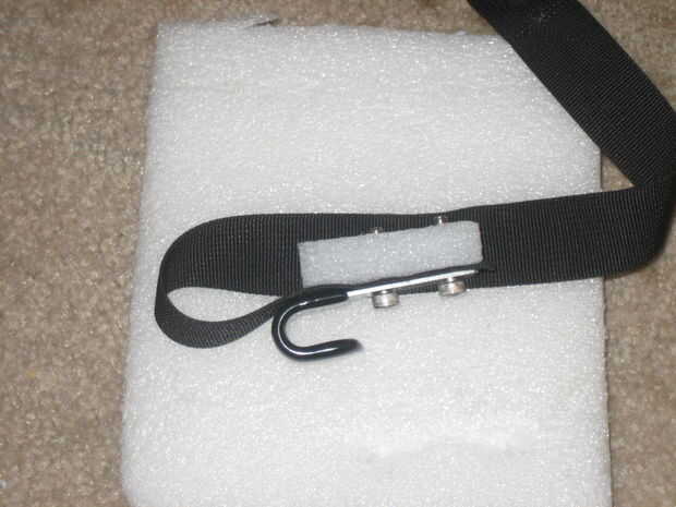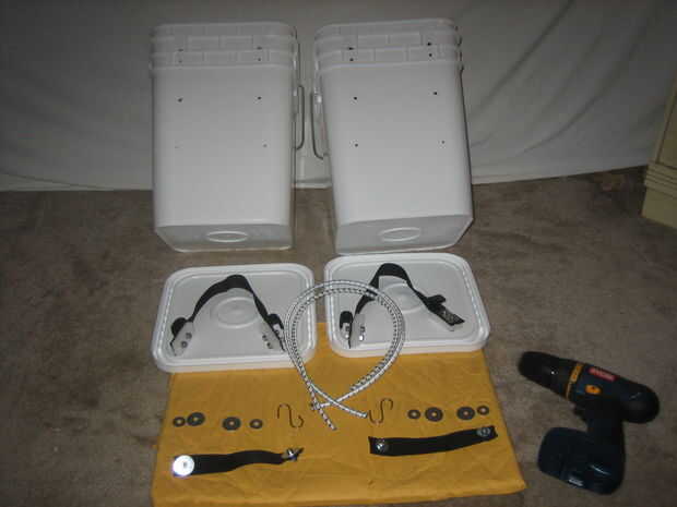En la foto a continuación están los cubos perforados/recortado y la correa lleva montado el amortiguador auxiliar montado correa de retención. Cable de descarga, también conocido como Bungee, es barato, así que compré nuevo en longitudes de aproximadamente 2'. OverKill... mejor que underkill. Realmente sólo necesitamos unos 18-20 pulgadas.