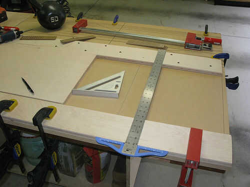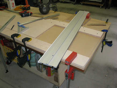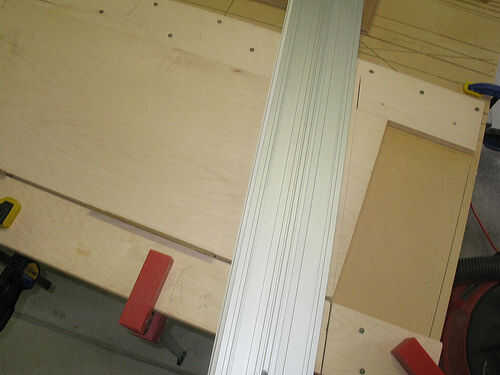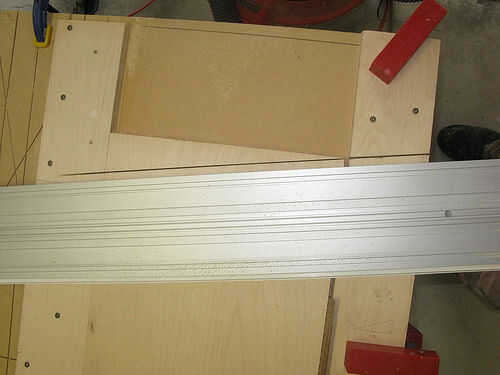 Ya que este corte va a ir completamente a través del riel inferior que desea asegurarse de que la porción de corte más pequeños está asegurada. Puedes ver que cambiado de puesto uno de mis pinzas sobre así como añadió un par de tornillos.