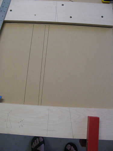 Ahora todo lo que necesita hacer es establecer su regla a lo largo de esta línea y asegúrelo. Mi sierra guías tienen abrazaderas de perfil bajo que se deslizan en el carril inferior, por lo que no se pueden ver. Antes de esto drásticas, querrá usar algo para levantar este sólo un pelo. No y encontró desde el principio fue difícil deslizar las tiras por debajo de ella. Terminé añadiendo algún cartón delgado que tal vez 1/32", y ayudó a.