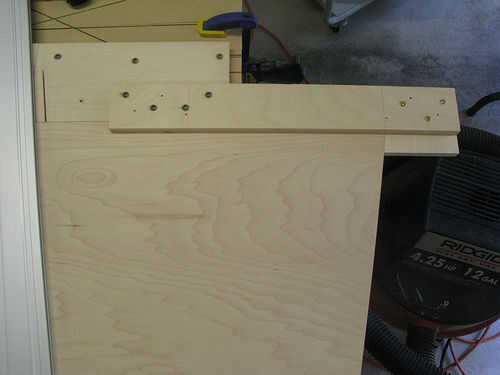 Equivoqué arriba algo más en este punto. La cara del bloque de parada fue al ras contra el riel superior y así muy ceñidos a la franja por debajo de ella. Tanto es así que era muy difícil mover las tiras. Terminé forro mis tornillos y deslizamiento de unas arandelas pequeñas entre el tope y el carril como separadores, como había hecho con las tiras de cartón bajo la regla.