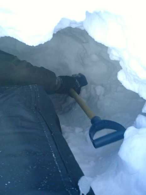 Este proceso de ahuecamiento lleva mucho más tiempo que el proceso de acumulación, porque sólo puede tener una persona en un momento el hacer un túnel. Realmente te ayuda, alguien en el exterior quitando la nieve que obtiene empujada fuera de la quinzee.