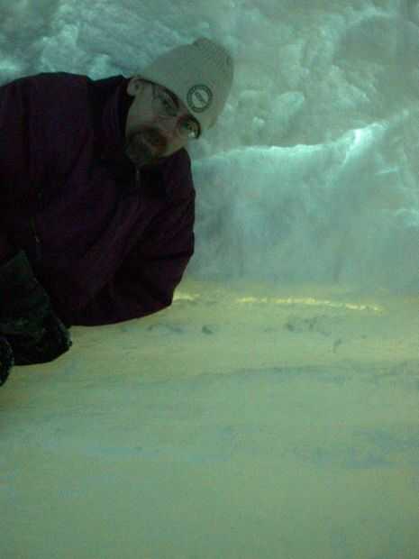 ¿Cuál fue el resultado de todo este trabajo extra? La luz del sol brilló hacia abajo a través de la ventana de hielo fuera de la quinzee y fue transmitido para arriba a través del hielo en el piso, dando una maravillosa luz verde.