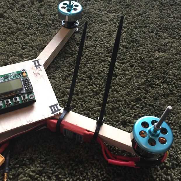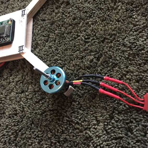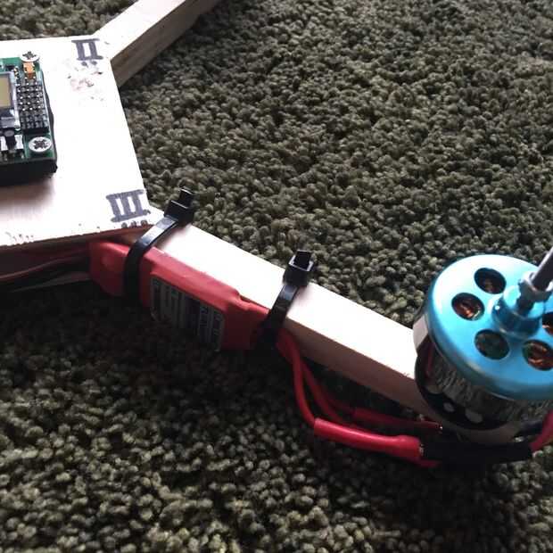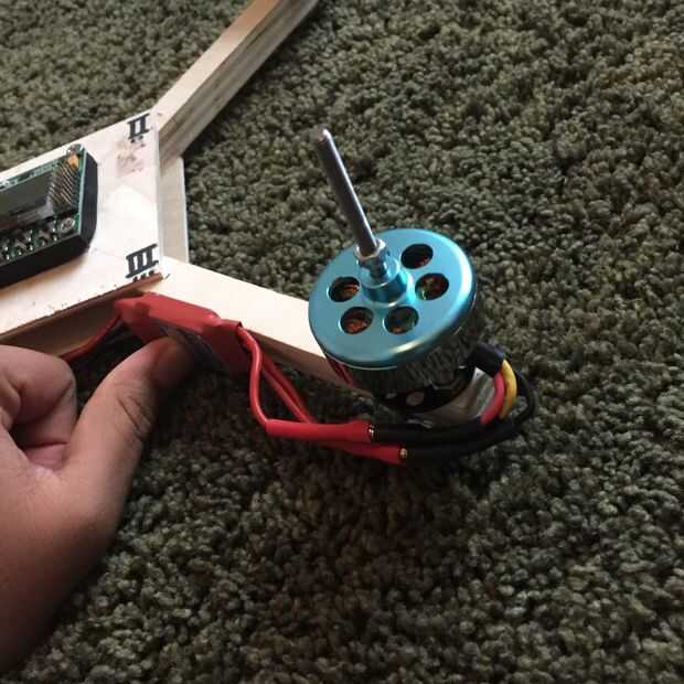 • Conecte los tres cables del motor a los tres cables ESC, envuelva los cables contra un lado y sostenga la ESC contra la viga donde se encuentra con la parte superior del marco. Utilizar dos abrazaderas de plástico para sujetar firmemente la ESC para el marco.