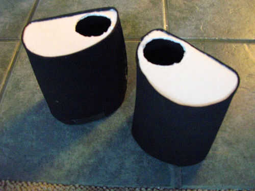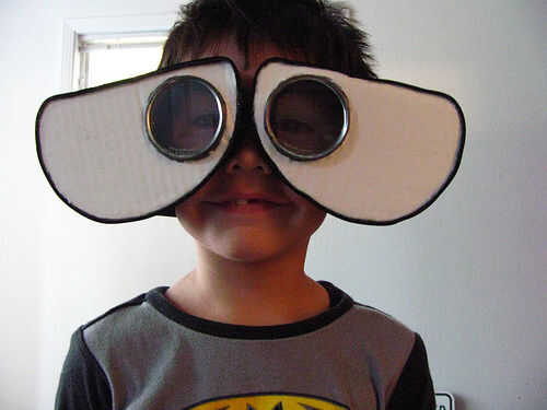 Utilizando las plantillas de papel original, volver a cortar hacia fuera los ojos con una cartulina rígida (desde el macbook pro caja) y dos lados de la goma espuma. Con mi hijo como plantilla, recortar un espacio para la cabeza para que sean usables.