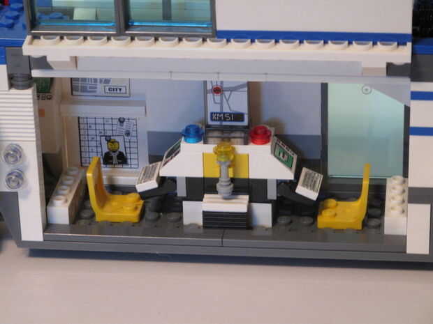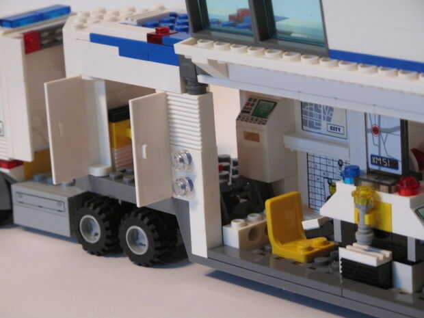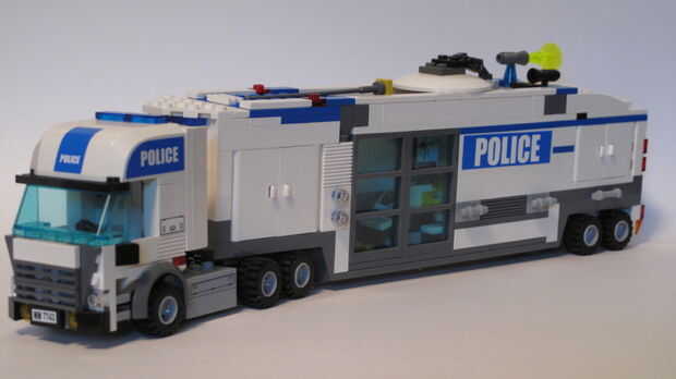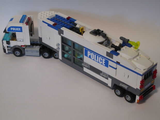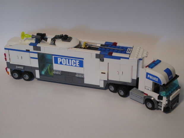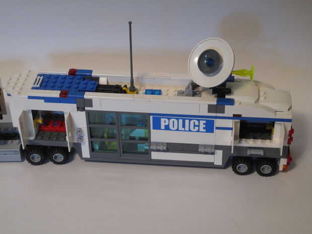 Este modelo es una versión modificada del conjunto original de Lego, Centro de mando de policía 7743. Utiliza la misma cabina pero un trailer diferente. Windows se agregan a las paredes del remolque para ver el interior. Uno de los principales problemas que tuve con este sistema era la cárcel siempre cayendo, así que construyó las puertas en el trailer sí mismo y ha añadido una ventana de la cárcel a la espalda (esto también hizo la celda de la cárcel un pelín más grande). El armario pequeño en el frente lleva en el área de trabajo (originalmente fue cerrado apagado). También he añadido un satélite y algunas cosas al azar para ir en el techo.