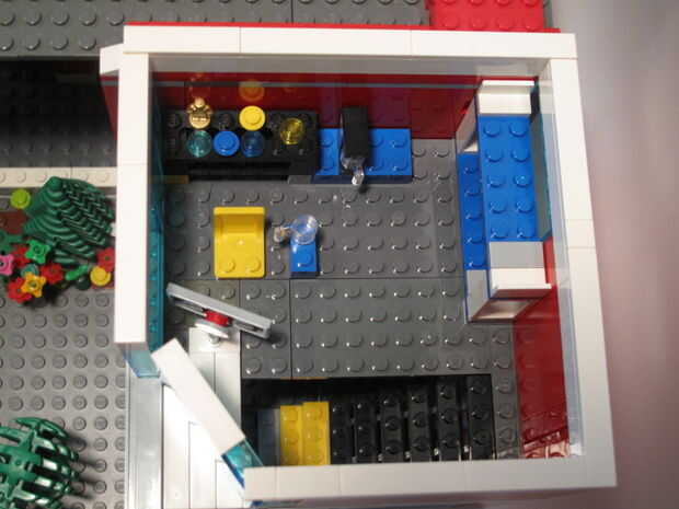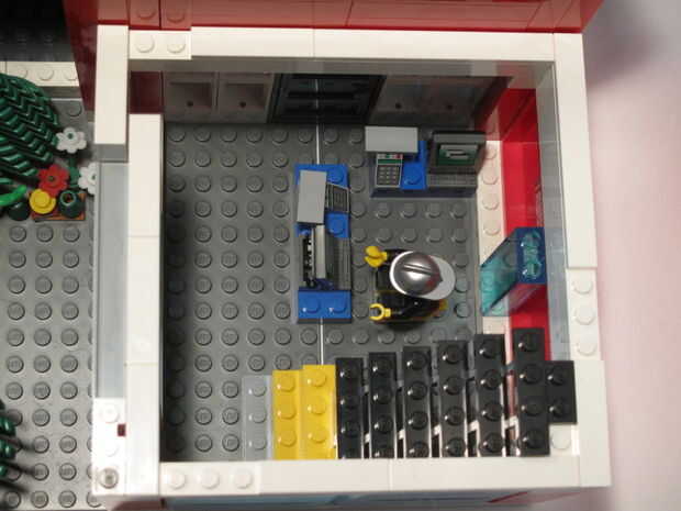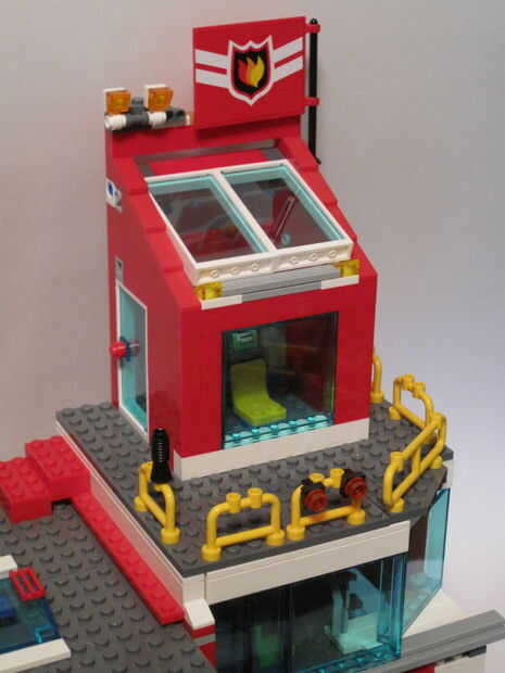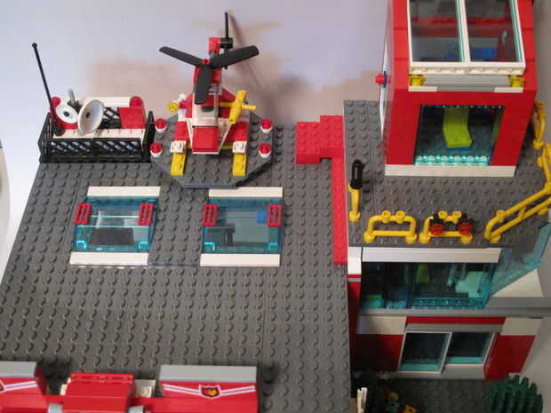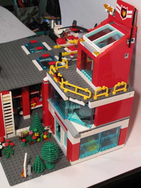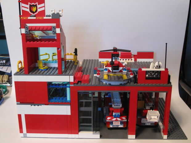 My brother (Jag56) designed this building. Esta estación de bomberos utiliza piezas de bomberos 7945 y 7208 Parque de bomberos. Como la estación de policía, utiliza módulos y tiene paredes posteriores. Los garajes se hicieron más altos que los garajes estándar. Las habitaciones tienen un montón de ventanas azules, y hay un helipuerto en la parte superior para mantener el helicóptero más pequeño del mundo. También hay alguna habitación en el edificio del garaje.