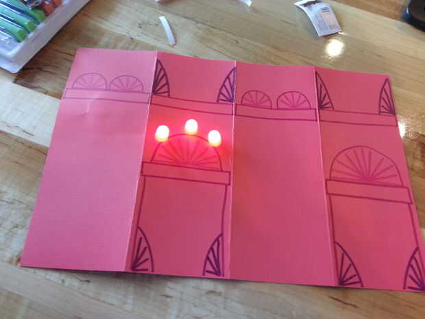 Su batería de botón a la línea de cinta de cobre positiva con la cinta el lado hacia abajo usando dos tiras de cinta adhesiva transparente +. Poner una tira de cinta a cada lado de la batería, dejando el centro libre. Utilice otro pequeño trozo de cinta de cobre para conectar el negativo de la línea a - lo de la batería en la parte expuesta. Este es el conmutador, para apagarlo simplemente pelar detrás la cinta.