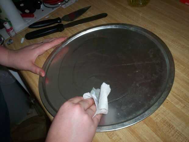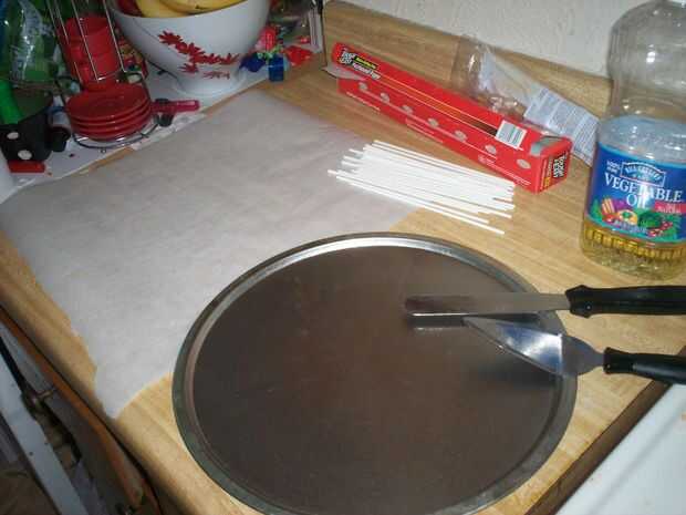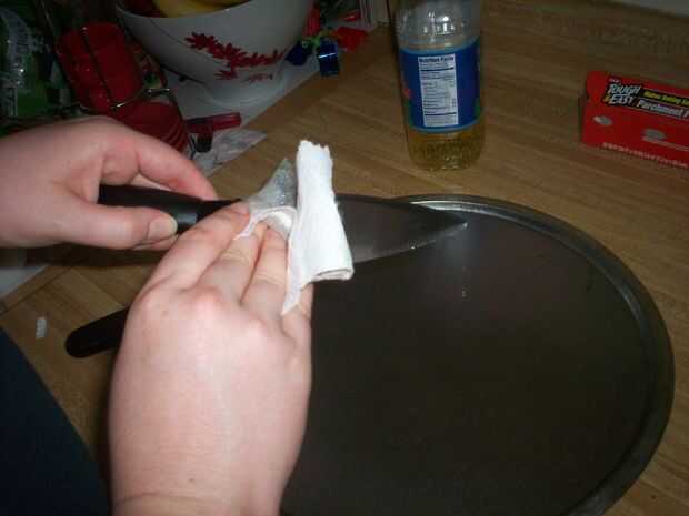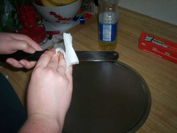 1) aceite de sus herramientas: Vierta una pequeña cantidad de aceite en medio de su hoja de losa o de la hornada y utilice una toalla de papel para extenderlo finas alrededor de la superficie. Utilizar la toalla de papel aceitado para difundir una delgada después de aceite sobre sus espátulas de metal y tijeras. Deje el aceite disponible para sus manos, lo necesitarás más adelante.