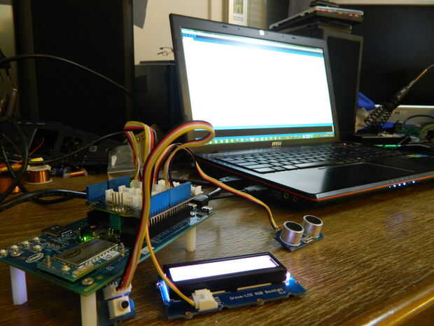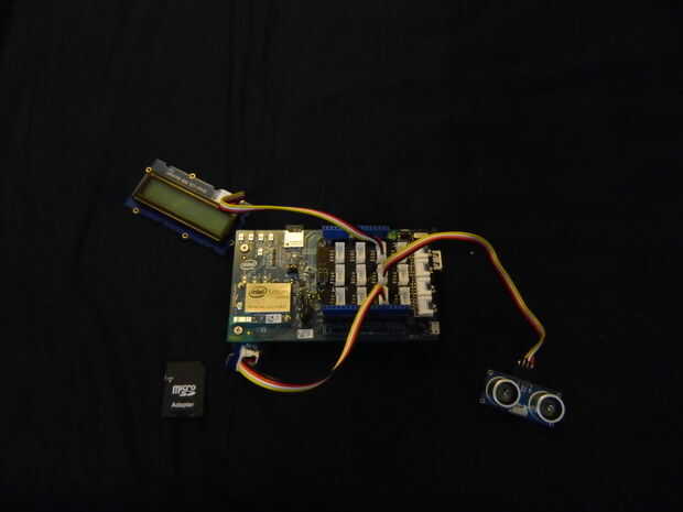 void setup() { Serial.begin (115200); pinMode(pinButton, INPUT); lcd.begin(16, 2); lcd.setRGB(colorR, colorG, colorB); pinMode(trigPin, OUTPUT); pinMode(echoPin, INPUT); pinMode(LEDPin, OUTPUT); Serial.print("Start write to card."); if (!SD.begin(chipSelect)) { Serial.println("No card or failure"); return; } Serial.println("Card found"); } A continuación, empezar a trabajar con Void loop.