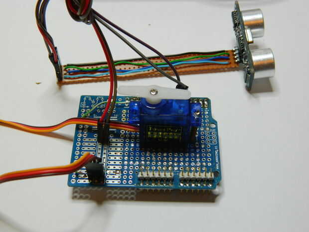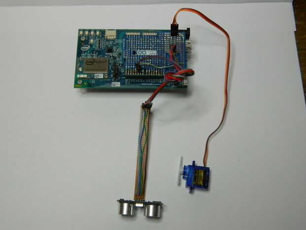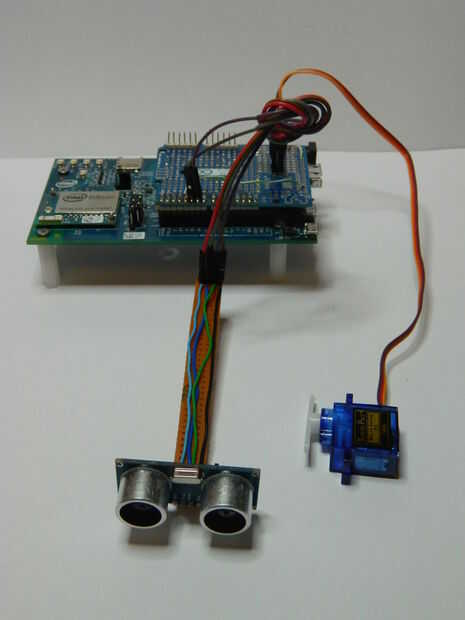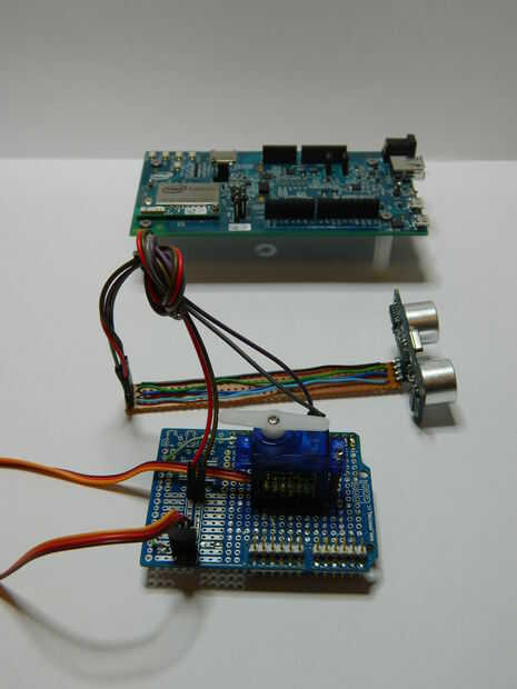 Lo básico de esto es que Edison (con alimentación externa) potencia el sensor de ultrasonido y el servo.