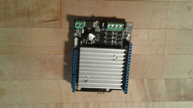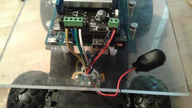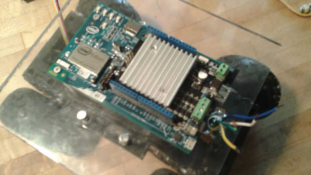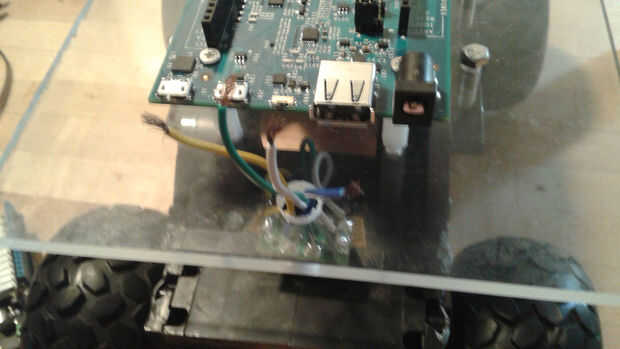 He utilizado el protector de motor de Seeed Studio de Radio Shack en algunos proyectos antes de. Es muy simple y se conecta en el Arduino y trabajos. Puesto que la Edison es montada en un tablero de arranque con una huella de Arduino, pensé que el escudo de Seeed sería una solución más elegante que el tablero de conductor del motor que viene en el kit del concurso IOT. He montado y había conectado los cables del motor. Puesto que el chasis RC tenía una batería de ocho celdas AA, sólo prevista reemplazar la alimentación del motor con el mismo. Tenía una batería de 8 células AA con conector 9v, así que había atornillado a un clip de batería de 9v en el protector de motor y enrutados a través de la plataforma en la parte inferior del chasis.
